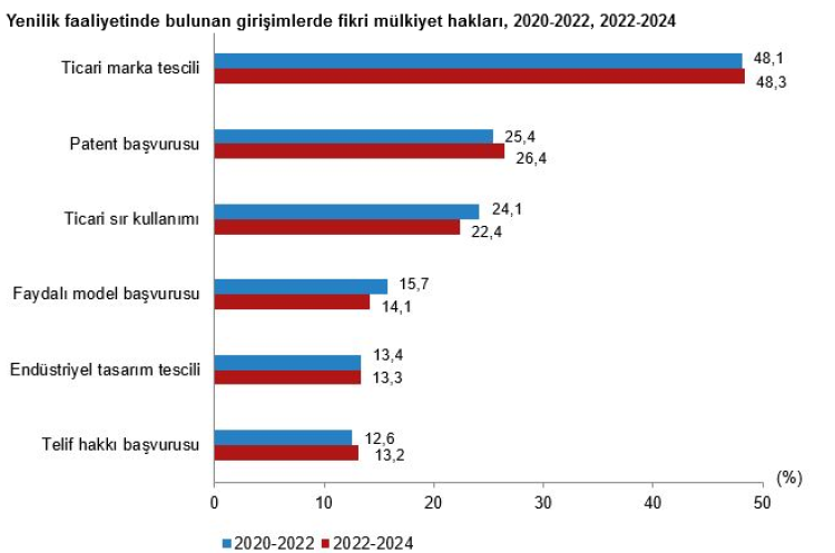 Her 4 girişimden biri patent başvurusunda bulundu. Başvurularda; yüzde 48,3 ticari marka tescili, yüzde 26,4 patent başvurusu, yüzde 22,4 ticari sır, yüzde 14,1 faydalı model, yüzde 13,3 endüstriyel tasarım, yüzde 13,2 telif hakkı başvurusu yapıldı.