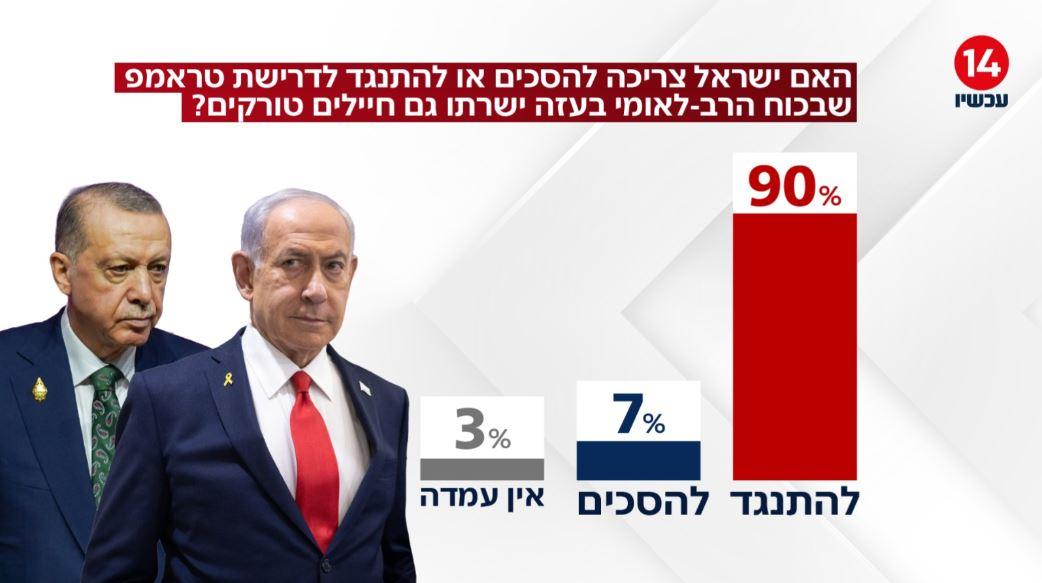 Kanal14’te yayınlanan anket sonuçlarına göre İsrail halkının yüzde 90’ı uluslararası gücün Erdoğan’ın komutasındaki Türk askerlerinin Gazze’de bulunmasına karşı çıkıyor.