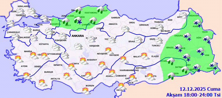 Geçtiğimiz günlere göre daha az yağışlı bir Cuma günü yurt geneline hakim olacak ancak Meteoroloji kar beklenen illeri de uyardı. Erzurum, Kars, Ardahan, Van, Muş, Bayburt, Hakkari ve Bitlis kar etkisinde olacak.