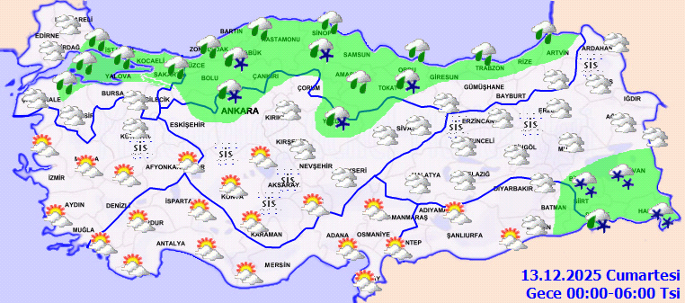 Meteoroloji Genel Müdürlüğü tarafından yapılan tahminlere göre yurdun kuzey, iç ve doğu kesimleri parçalı ve çok bulutlu, Marmara’nın kuzeyi, Karadeniz (Çorum Haric), Doğu Anadolu’nun doğusu, Güneydoğu Anadolu’nun doğusu ile Ankara, Çankırı, Yozgat ve Bingöl çevrelerinin yağışlı, diğer yerlerin parçalı ve az bulutlu geçeceği tahmin ediliyor.