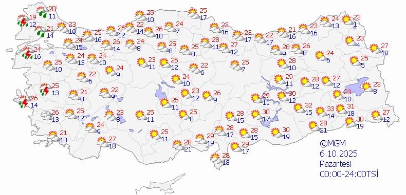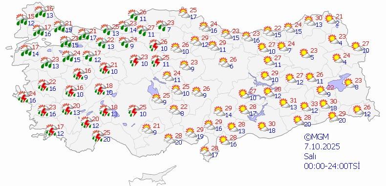 Hava, parçalı ve çok bulutlu, zamanla kıyı kesimlerinde sağanak ve gök gürültülü yağışlı bir seyir izleyecek. Gece saatlerinde Kuzey Ege kıyılarının yerel kuvvetli yağışlardan etkilenmesi bekleniyor. Rüzgarın da bu bölgelerde yer yer kuvvetli (40-60 km/sa) eseceği öngörülüyor.
