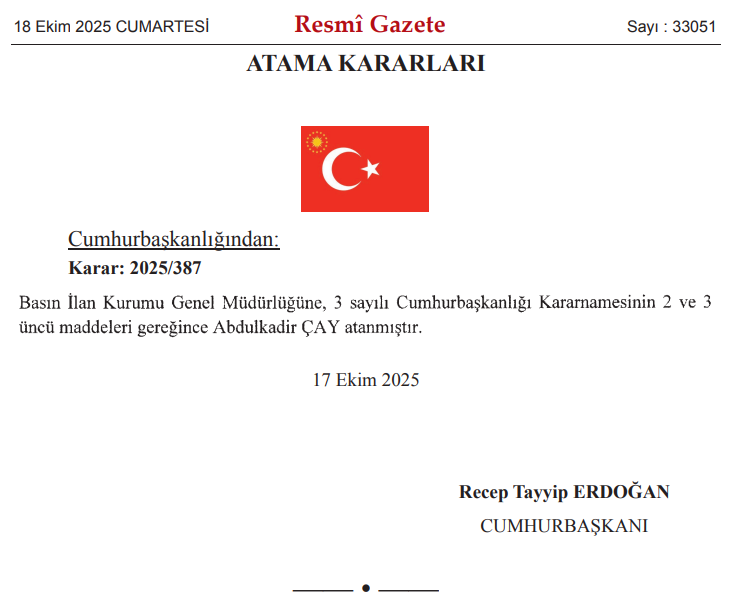 18 Ekim 2025 tarihli ve 33051 sayılı Resmî Gazete kararları yayınlandı. Vatandaşların yakından takip ettiği Resmi Gazete’de, Basın İlan Kurumu Genel Müdürlüğüne Abdulkadir Çay atanırken, bakanlıklarda ve üst düzey kamu kurumlarında bazı değişikler yapıldı. Milli Eğitim Bakanlığı, Mesleki ve Teknik Eğitim Genel Müdürü Ali Karagöz, Bilgi İşlem Genel Müdürü Özgür Türk görevden alındı. Milli Eğitim Bakanlığı Talim ve Terbiye Kurulu Başkanlığına Cihad Demirli, Mesleki ve Teknik Eğitim Genel Müdürlüğüne, Antalya İl Milli Eğitim Müdürü Salih Kaygusuz, Bilgi İşlem Genel Müdürlüğüne Ersin Karaman atandı. İşte, Resmi Gazete atamaları ve ayrıntılar.