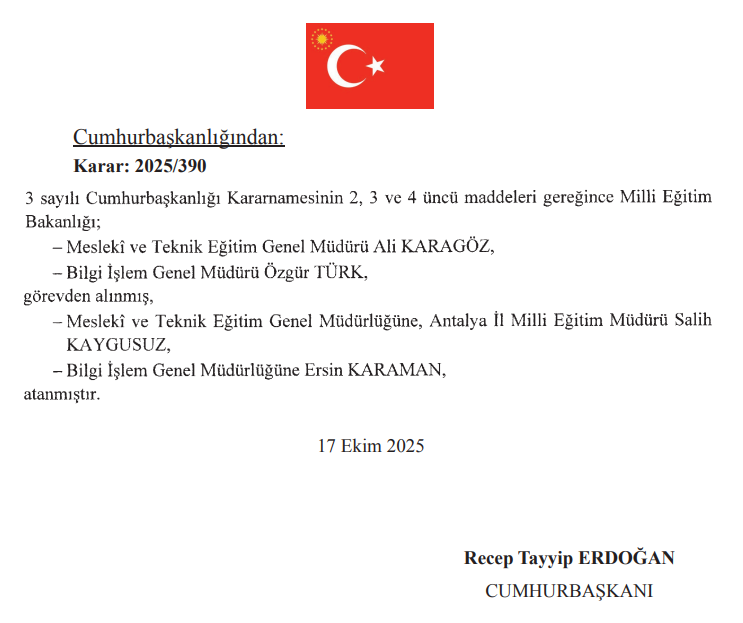 Milli Eğitim Bakanlığı, Mesleki ve Teknik Eğitim Genel Müdürü Ali Karagöz, Bilgi İşlem Genel Müdürü Özgür Türk görevden alındı. Milli Eğitim Bakanlığı Talim ve Terbiye Kurulu Başkanlığına Cihad Demirli, Mesleki ve Teknik Eğitim Genel Müdürlüğüne, Antalya İl Milli Eğitim Müdürü Salih Kaygusuz, Bilgi İşlem Genel Müdürlüğüne Ersin Karaman atandı.